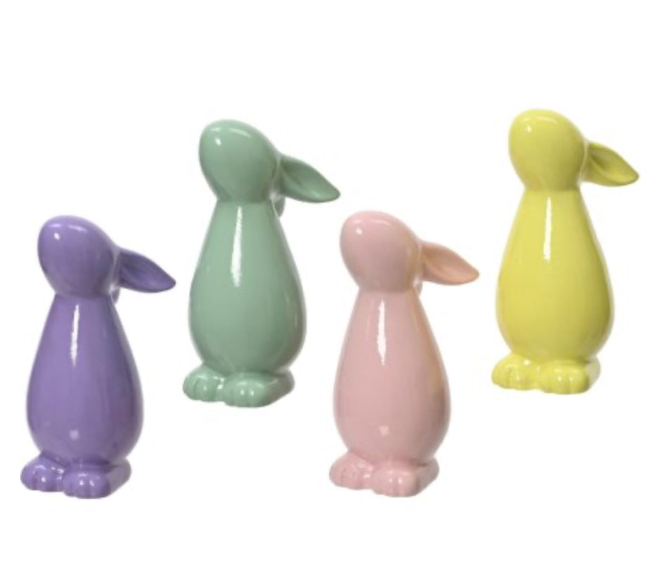 These colourful bunny ornaments will add a touch of whimsy and charm to any home. These bunnies come in pastel colours, each with a shiny finish. Perfect for decorating shelves, tables, mantles or any other surface in the home this Easter. These playful bunnies will bring a smile to anyone's face and a burst of colour to the space.