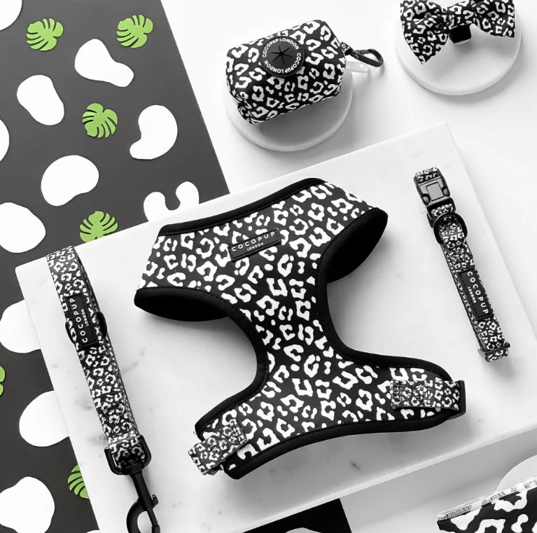 Take a walk on the wild side with Black Leopard Adjustable Neck Harness. Featuring a classic monochrome print, this stylish harness is perfect for a fashionable dog walk. Keep your pup safe and looking fierce!